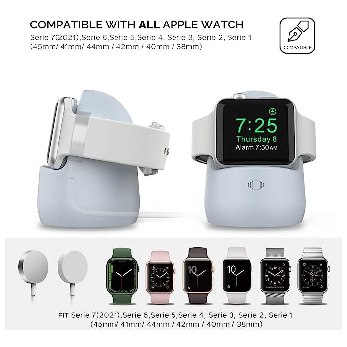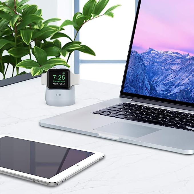Compatible with Apple Watch Series 8 (2022), Ultra (2022), SE2 (2022), Series 7, Series 6, Series 5, Series 4 , Series 3, Series 2, Series 1, Series SE (49mm/45mm/44mm/42mm/41mm/40mm/38mm). Please Note: that Please Remove the Case When Applying to the Apple Watch Ultra 49mm (2022). Designed to make charging and displaying your Apple Watch as convenient as possible by acting as a nightstand or desk dock stand that keeps your Apple Watch Charger securely in place and keeps your cable tidy Made from premium silicone material,enhances the stability and protects your Apple devices away from scratching. Simply place your Apple Watch on the stand to charge your watch; keep this stand near your bed to allow use of key functions such as alarm clocks and messages. The silicone stand work with original iWatch adapters ONLY. Cables, Adapters and Devices are NOT included.