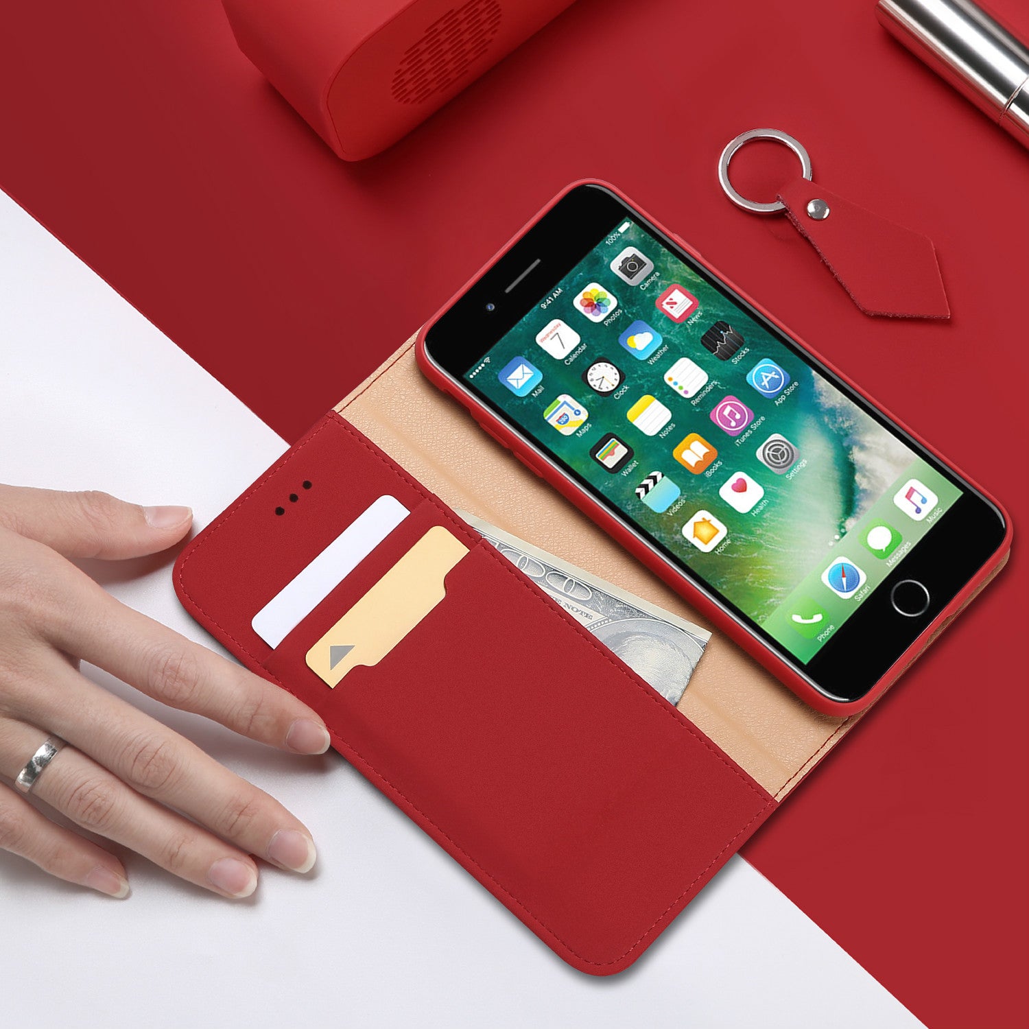 DUX DUCIS Real Genuine Leather Flip Wallet Case for Apple iPhone SE 2022, SE 2020, 8, 7 – Red