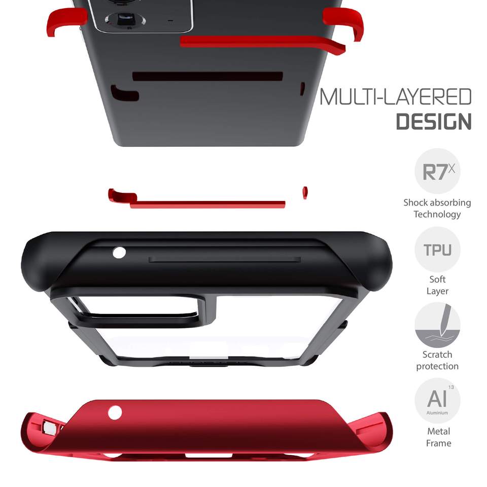 With an advanced reinforced dual-layer design, the ATOMIC SLIM phone case will protect your phone from anything life might throw at it. This premium clear case is built with an Atomic – aluminum alloy bumper frame. The tough aluminum metal helps your phone withstand drops from up to 12 Feet. The case has even been military-grade standard drop tested and passed with flying colors. The core of the case is an ultra-thin flexible TPU inner skin. The outer layer of this military-grade phone case features raised shock absorbing corners and a lifted bezel for the extra camera and screen protection. There is also our advanced cutting-edge R7x shock absorption technology built-in. All combined, the ATOMIC SLIM case offers true, state-of-the-art shockproof drop resistance. A premium case should not just protect though. With this clear case you also have an ultra-slim, elegant design. The case’s scratch-resistant clear back window lets you show off your beautiful new phone. The case itself also comes with different colors to choose from to perfectly match your style. With the case on, you won’t lose any functionality. All buttons and ports are easily accessible on the phone. There is also a precision S-Pen stylus cutout. With this aluminum case, your device will still be wireless charging compatible and support wireless PowerShare. Advanced Reinforced Dual Layer Design Extreme Heavy Duty Protection Ultra Tough Military Grade Space Aluminum Atomic Aluminum Alloy Bumper Frame Ultra-Thin Flexible TPU Inner Skin Cutting-edge R7x Shock Absorbing Technology Scratch Resistant Clear Back Window Raised Shock Absorbing Edge Corners Comfortable Anti-Slip Hand Grip Lifted Bezel for Camera and Screen Protection Military Grade Standard Drop Tested Withstands Drops from 12 Feet Supports Wireless Charging and PowerShare Ultrasonic Fingerprint Unlock Compatible S-Pen Stylus Cutout Materials Aluminum Alloy Frame Flexible TPU Inner Skin