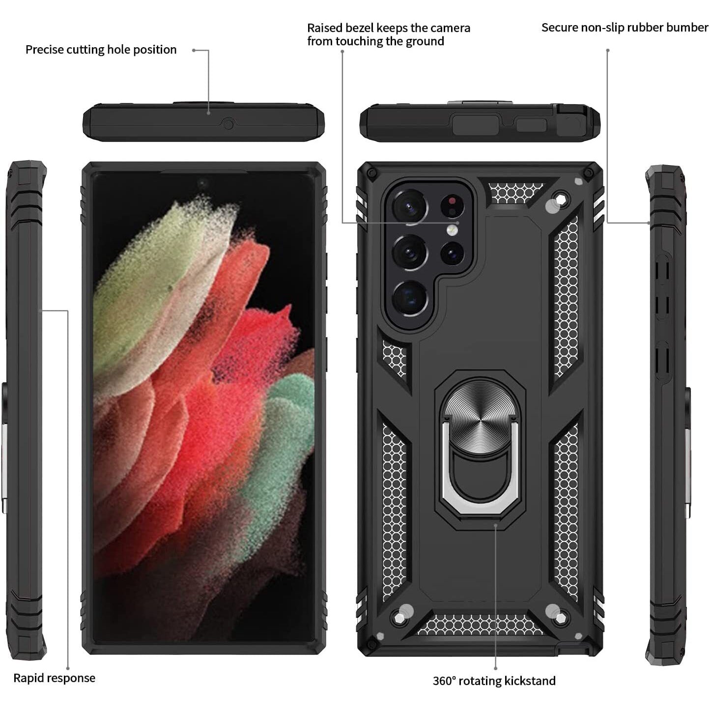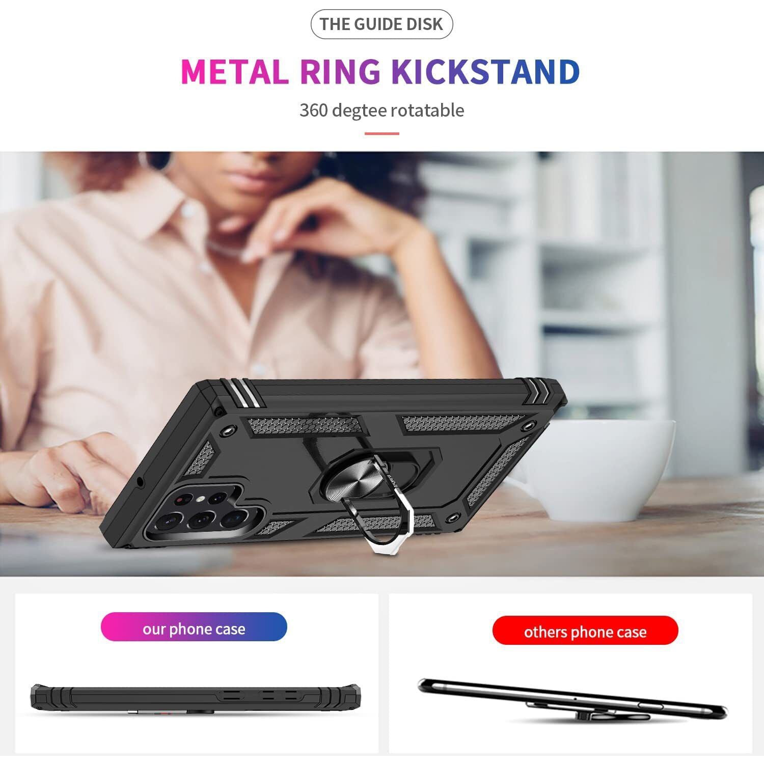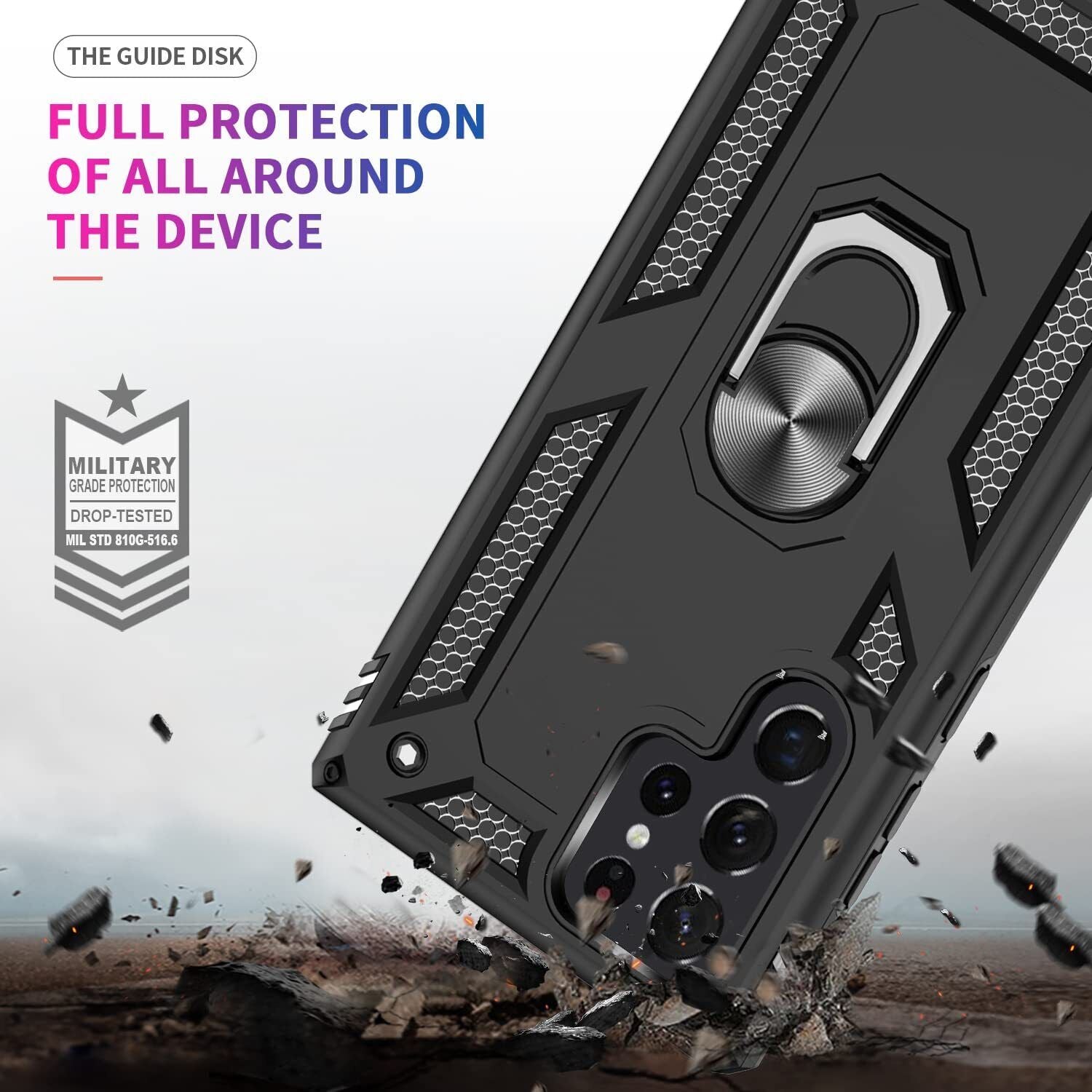 LeYi for Samsung Galaxy S22 Ultra 5G Case,Ring Holder Military Grade Protective Silicone Shockproof Heavy Duty Tough Armour Hard Plastic Mobile Phone Cover for Samsung Galaxy S22 Ultra 5G Black The phone case is compatible with the original Samsung Galaxy S22 Ultra 5G,If using wireless charging, please remove the phone case. Tough Defender : Sturdy but stylish, Heavy Duty Protection and Air Cushion Technology. The edge elastic TPU is combined with the built-in hard PC, high-elastic protection, high-strength anti-drop, and avoid scratching. 360° Rotatable Ring: Phone ring stand can be rotated ,adjust to any angle you need. When you watch movies or video,it can provide you the optimum viewing position. Besides,Built-in metal magnetic sheet for stable adsorption,which can be directly adsorbed to the magnetic car phone holder. Perfect Fit: Hole precise cutting,Button reaction sensitive,Easy easy to install and remove